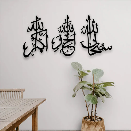 Elevate the beauty of your home or office with this elegant set of 3 Islamic wall art pieces, each featuring a powerful phrase of remembrance: Subhan Allah, Alhamdulillah, and Allahu Akbar. Crafted from a combination of high-quality